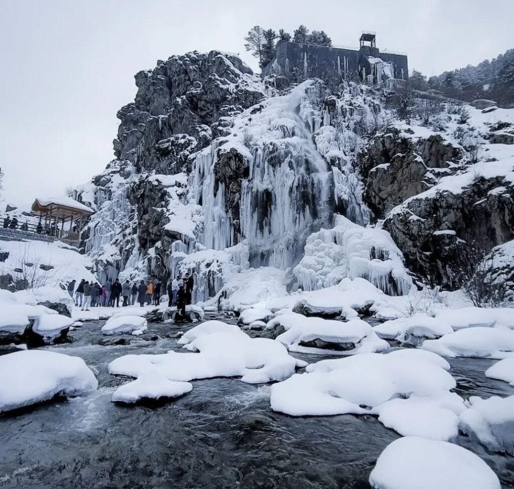 The Drung Waterfall is a waterfall in the Indian Union state of Jammu and Kashmir. It is close to Tangmarg. It’s about 3 km away from Tangmarg town. In the winter, though, the place is very different. It freezes over from late December to early February. That’s why people call it Drung Frozen Waterfall. The water freezes into thick walls of ice. The valley all around it is also covered in snow. The waterfall is full of clear water in the summer, especially in the beginning of the season. It’s also a picnic area for children.